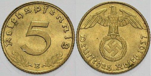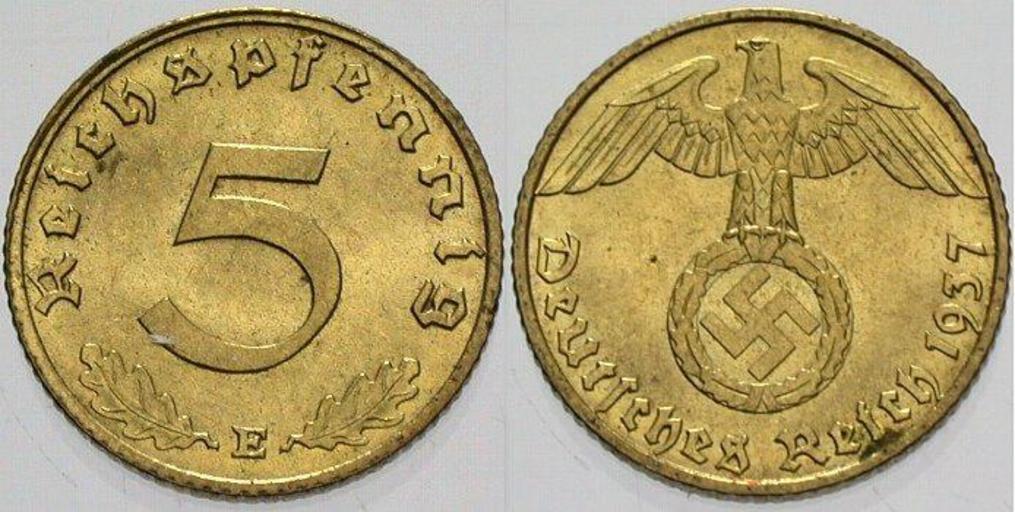 Keywords: 5Reichspfennig1.JPG es Moneda de 5 pfennig Nazi German 5 pfennig 1/100 of a Reichsmark German coin Reichsbank photograph by Turkmenistan 1937 Coin PD-GermanGov-currency coin <br/>Photograph nazi symbol Reichsmark coins of the Third Reich 0005 1937 |