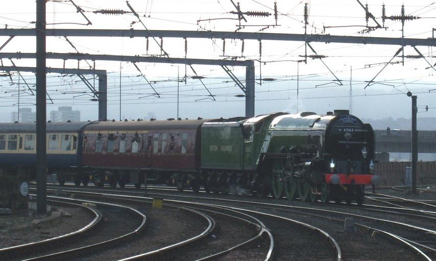 | Keywords: 60163 Tornado at Newcastle 31 Jan 09 pic 1.jpg Under the wires On her maiden passenger voyage the brand new steam locomotive no 60163 Tornado approaches Newcastle Central Station under the wires of the electrified East Coast Main Line in Newcastle upon Tyne northern England Tornado approached Newcastle just after 13 20 GMT on Saturday 31 January 2009 on her first main line passenger journey The Peppercorn Pioneer This train had started in York to the south arriving in Newcastle over the King Edward VII Bridge Tornado is approaching Platform 2 from the West with her support coach and a rake of 12 passenger carriages behind it photographed from Platform 3 After the picture was taken Tornado journeyed to Tyne Yard for servicing before returning to haul the return journey at 16 34 GMT Tornado is a 100 new locomotive completed in 2008 the first new main line steam locomotive to be built in Britain for almost 50 years She was built to the London and North Eastern Railway LNER design of the original A1 Peppercorn Class locomotives built in 1948/9 The original locomotives were also used to haul express trains on the East Coast Main Line Tornado wears the historic Apple Green livery of LNER although with 'British Railways' on the tender the first livery worn by 30 members of the original 49 strong Peppercorn A1 class The original locomotives entered service with the nationalised British Railways which absorbed the LNER and other private railway companies in 1948 The original A1 class were all scrapped by 1966 after a relatively short service life after the railway Modernisation Plan of the 1950s called for the replacement of steam with modern traction comprising both diesel and electric locomotives On her maiden voyage Tornado was carrying 500 financial supporters of the A1 Steam Locomotive Trust on The Peppercorn Pioneer named in honour of Arthur Peppercorn the chief engineer of the LNER and the original designer of the Peppercorn A1 class of locomotive The A1 Trust are a Darlington based charity who built the locomotive in a project dating back to 1990 and costing £3 million own 31 January 2009 midday User Ultra7 cropped Ultra7 60163 Tornado at Newcastle 31 Jan 09 pic 2 jpg LNER Peppercorn Class A1 60163 Tornado at Newcastle Central station LNER Peppercorn Class A1 60163 Tornado in LNER Apple Green livery LNER Peppercorn Class A1 60163 Tornado in 2009 LNER Peppercorn Class A1 60163 Tornado all files LNER Peppercorn Class A1 60163 Tornado in colour photographs 31 January Maiden voyages January 2009 in Newcastle upon Tyne |