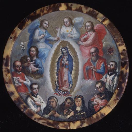 | Keywords: 6179 Virgen de Guadalupe.jpg accession number Francisco Martínez ¿ -1758 credit line es Virgen de Guadalupe acompañada por los santos José con el Niño Ignacio de Loyola Luis Gonzaga Ana Diego de Alcalá Brígida Estanislao de Kostka Francisco Javier y Joaquín bajo la protección del Sagrado Corazón de Jesús y la Santísima Trinidad Escudo de Monja en Our Lady of Guadalupe Surrounded by Saints Joseph with Child Ignatius of Loyola Aloysious Gonzaga Anne Diego of Alcala Bridget Stanislaus Kostka Francis Xavier and Joaquim under the Protection of the Sacred Heart of Jesus and the Holy Trinity Nun's Shield Width cm 15 1 exhibition history Institution Museo Soumaya Plaza Carso oil gold copper object history object type PD-US PD-old-100 place of creation Template Museo Soumaya Donation PD-Art-100 Images donated by Museo Soumaya Nun's shields of the Museo Soumaya collection |