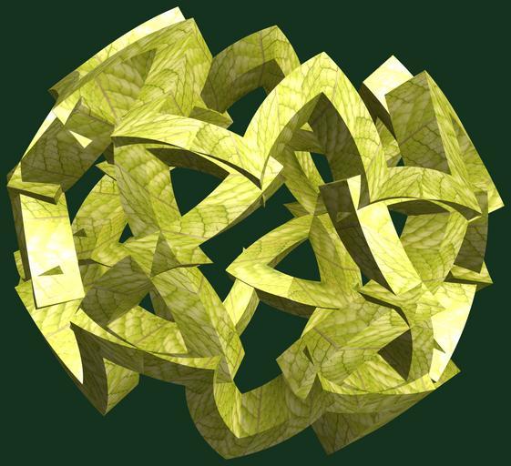 | Keywords: mathematica 3d cg parametricplot3d texture torus code program algorithm プログラム コード アルゴリズム 輪環 りんかん ドーナツ どーなつ 六芒星 ろくぼうせい geometric sculpture geometricsculpture shape geometry sculpture mapping テクスチャ マッピング 模様 もよう abstract 抽象 ちゅうしょう アブストラクト design pattern デザイン パターン graphic グラフィック グラフィクス structure 意匠 構造 symmetry 対称性 たいしょうせい シンメトリー 対称 たいしょう leaf plant foliage food a = 4; (* center hole size *) b = 6; (* hexa-torus *) c = -9; (* distance from the center of rotation *) d = 6; (* number of torus *) h = 1; (* height of a torus *) SetOptions[ParametricPlot3D, PlotRange -> Full, Mesh -> None, Boxed -> False, Axes -> False, PlotPoints -> 400, ImageSize -> 3000, Background -> RGBColor[{20, 50, 30}/255], PlotStyle -> Directive[Specularity[White, 30], Texture[Import["D:/tmp/71.jpg"]]], TextureCoordinateFunction -> ({#4, #5 Pi} &), Lighting -> "Neutral"]; f[v_] := TriangleWave[{-1, 1}, v/(2 Pi)]; g[v_] := TriangleWave[{-1, 1}, v/(2 Pi) + 1/4]; x = (a - g[t] - f[b s]) Cos[s]; y = (a - g[t] - f[b s]) Sin[s]; z = (a - f[t] - h f[b s]) + c; rm = Table[{x, y, z}.RotationMatrix[2 i Pi/d, {1, 1, 0}], {i, d}]; ParametricPlot3D[rm, {t, 0, 2 Pi}, {s, 0, Pi}] (*--- The Texture *) a = 4; (* center hole size *) b = 6; (* hexa-torus *) c = -9; (* distance from the center of rotation *) d = 6; (* number of torus *) h = 1; (* height of a torus *) SetOptions[ParametricPlot3D, PlotRange -> Full, Mesh -> None, Boxed -> False, Axes -> False, PlotPoints -> 400, ImageSize -> 3000, Background -> RGBColor[{20, 50, 30}/255], PlotStyle -> Directive[Specularity[White, 30], Texture[Import["D:/tmp/71.jpg"]]], TextureCoordinateFunction -> ({#4, #5 Pi} &), Lighting -> "Neutral"]; f[v_] := TriangleWave[{-1, 1}, v/(2 Pi)]; g[v_] := TriangleWave[{-1, 1}, v/(2 Pi) + 1/4]; x = (a - g[t] - f[b s]) Cos[s]; y = (a - g[t] - f[b s]) Sin[s]; z = (a - f[t] - h f[b s]) + c; rm = Table[{x, y, z}.RotationMatrix[2 i Pi/d, {1, 1, 0}], {i, d}]; ParametricPlot3D[rm, {t, 0, 2 Pi}, {s, 0, Pi}] (*--- The Texture *) |