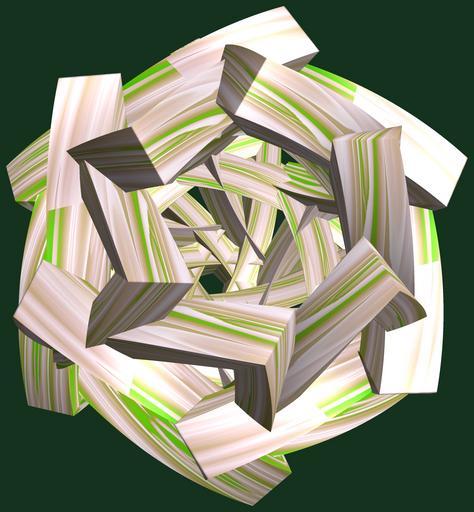 | Keywords: mathematica 3d cg parametricplot3d texture torus code program algorithm tri-torus tritorus プログラム コード アルゴリズム 輪環 りんかん ドーナツ どーなつ 四芒星 しぼうせい geometric sculpture geometricsculpture shape geometry sculpture mapping テクスチャ マッピング 模様 もよう abstract 抽象 ちゅうしょう アブストラクト design pattern デザイン パターン graphic グラフィック グラフィクス structure 意匠 構造 symmetry 対称性 たいしょうせい シンメトリー 対称 たいしょう photo border a = 4; (* center hole size *) b = 4; (* tetra-torus *) c = 5; (* distance from the center of rotation *) d = 6; (* number of torus *) h = 2; (* height of a torus *) SetOptions[ParametricPlot3D, PlotRange -> Full, Mesh -> None, Boxed -> False, Axes -> False, PlotPoints -> 400, ImageSize -> 3000, Background -> RGBColor[{20, 50, 30}/255], PlotStyle -> Directive[Specularity[White, 70], Texture[Import["D:/tmp/862.jpg"]]], TextureCoordinateFunction -> ({#4 + #5, #5 / Pi} &), Lighting -> "Neutral"]; f[v_] := TriangleWave[{-1, 1}, v/(2 Pi)]; g[v_] := TriangleWave[{-1, 1}, v/(2 Pi) + 1/4]; x = (a - g[t] - f[b s]) Cos[s] + c; y = (a - g[t] - f[b s]) Sin[s] + c; z = (a - f[t] - h f[b s]); rm = Table[{x, y, z}.RotationMatrix[2 i Pi/d, {1, 1, 1}], {i, d}]; ParametricPlot3D[rm, {t, 0, 2 Pi}, {s, 0, 2 Pi}] (*--- The Texture *) a = 4; (* center hole size *) b = 4; (* tetra-torus *) c = 5; (* distance from the center of rotation *) d = 6; (* number of torus *) h = 2; (* height of a torus *) SetOptions[ParametricPlot3D, PlotRange -> Full, Mesh -> None, Boxed -> False, Axes -> False, PlotPoints -> 400, ImageSize -> 3000, Background -> RGBColor[{20, 50, 30}/255], PlotStyle -> Directive[Specularity[White, 70], Texture[Import["D:/tmp/862.jpg"]]], TextureCoordinateFunction -> ({#4 + #5, #5 / Pi} &), Lighting -> "Neutral"]; f[v_] := TriangleWave[{-1, 1}, v/(2 Pi)]; g[v_] := TriangleWave[{-1, 1}, v/(2 Pi) + 1/4]; x = (a - g[t] - f[b s]) Cos[s] + c; y = (a - g[t] - f[b s]) Sin[s] + c; z = (a - f[t] - h f[b s]); rm = Table[{x, y, z}.RotationMatrix[2 i Pi/d, {1, 1, 1}], {i, d}]; ParametricPlot3D[rm, {t, 0, 2 Pi}, {s, 0, 2 Pi}] (*--- The Texture *) |