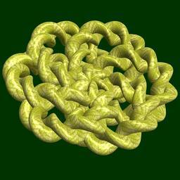 Keywords: mathematica 3d cg parametricplot3d texture torus knot 輪環 りんかん ドーナツ どーなつ 結び むすび 捩れ よじれ プログラム コード code program algorithm コード アルゴリズム geometric sculpture geometricsculpture shape geometry sculpture mapping テクスチャ マッピング 模様 もよう abstract 抽象 ちゅうしょう アブストラクト design pattern デザイン パターン graphic グラフィック グラフィクス structure 意匠 構造 symmetry 対称性 たいしょうせい シンメトリー 対称 たいしょう algorithm organic pattern plant foliage black background SetOptions[ParametricPlot3D, PlotRange -> Full, Mesh -> None, Boxed -> False, Axes -> None, PlotPoints -> 300, ImageSize -> 3000, Background -> Darker[Green, 0.8], PlotStyle -> Directive[Specularity[White, 90], Texture[Import["D:/tmp/71.jpg"]]], TextureCoordinateFunction -> ({#4, #5 b Pi} &), Lighting -> "Neutral"]; a = 5; (* center hole size of a torus *) b = 9; (* number of cross *) c = 5; (* distance from the center of rotation *) d = 6; (* number of torus *) x = (a - Cos[t] + Sin[b s]) Cos[2 s] + c; y = (a - Cos[t] + Sin[b s]) Sin[2 s] + c; z = Cos[b s] + Sin[t] + c; rot = Table[{x, y, z}.RotationMatrix[2 i Pi/d, {0, 1, 3}], {i, d}]; ParametricPlot3D[rot, {t, 0, 2 Pi}, {s, 0, 2 Pi}] (* --- The Texture is this: www.flickr.com/photos/tanaka_juuyoh/5239255695/ *) SetOptions[ParametricPlot3D, PlotRange -> Full, Mesh -> None, Boxed -> False, Axes -> None, PlotPoints -> 300, ImageSize -> 3000, Background -> Darker[Green, 0.8], PlotStyle -> Directive[Specularity[White, 90], Texture[Import["D:/tmp/71.jpg"]]], TextureCoordinateFunction -> ({#4, #5 b Pi} &), Lighting -> "Neutral"]; a = 5; (* center hole size of a torus *) b = 9; (* number of cross *) c = 5; (* distance from the center of rotation *) d = 6; (* number of torus *) x = (a - Cos[t] + Sin[b s]) Cos[2 s] + c; y = (a - Cos[t] + Sin[b s]) Sin[2 s] + c; z = Cos[b s] + Sin[t] + c; rot = Table[{x, y, z}.RotationMatrix[2 i Pi/d, {0, 1, 3}], {i, d}]; ParametricPlot3D[rot, {t, 0, 2 Pi}, {s, 0, 2 Pi}] (* --- The Texture is this: www.flickr.com/photos/tanaka_juuyoh/5239255695/ *) |