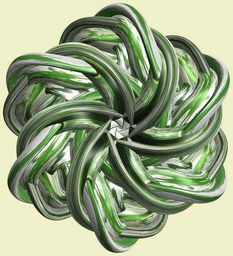 | Keywords: mathematica 3d cg parametricplot3d texture torus code program algorithm プログラム コード アルゴリズム 輪環 りんかん ドーナツ どーなつ トーラス とーらす knot 結び目 むすびめ mapping テクスチャ マッピング 模様 もよう design pattern デザイン パターン graphic グラフィック グラフィクス structure 意匠 構造 symmetry 対称性 たいしょうせい シンメトリー 対称 たいしょう white background indoor a = 6; (* center hole size of a torus *) b1 = 5;(* the number of angles *) b2 = 3;(* the number of waves *) b3 = 2; (* the number of knots *) c = 6; (* distance from the center of rotation *) d = 6; (* the number of tori *) h1 = 3; (* width of a torus *) h2 = 1; (* width of a torus *) h3 = 1; (* height of cross *) SetOptions[ParametricPlot3D, PlotRange -> Full, Mesh -> None, Boxed -> False, Axes -> None, PlotPoints -> 500, ImageSize -> 3000, Background -> RGBColor[{240, 240, 200}/255], PlotStyle -> Directive[Specularity[White, 50], Texture[Import["D:/tmp/911.jpg"]]], TextureCoordinateFunction -> ({#4, #5 /Pi} &), Lighting -> "Neutral"]; x = (a - h1 Cos[t] + h2 Sin[b1 s]) Cos[b3 s] + c; y = (a - h1 Cos[t] + h2 Sin[b1 s]) Sin[b3 s] + c; z = h3 Cos[b1 s] + Sin[b2 t] + c; rm = Table[{x, y, z}.RotationMatrix[2 i Pi/d, {1, 0, 1}], {i, d}]; ParametricPlot3D[rm, {t, 0, 2 Pi}, {s, 0, 2 Pi}] (*--- The Texture *) a = 6; (* center hole size of a torus *) b1 = 5;(* the number of angles *) b2 = 3;(* the number of waves *) b3 = 2; (* the number of knots *) c = 6; (* distance from the center of rotation *) d = 6; (* the number of tori *) h1 = 3; (* width of a torus *) h2 = 1; (* width of a torus *) h3 = 1; (* height of cross *) SetOptions[ParametricPlot3D, PlotRange -> Full, Mesh -> None, Boxed -> False, Axes -> None, PlotPoints -> 500, ImageSize -> 3000, Background -> RGBColor[{240, 240, 200}/255], PlotStyle -> Directive[Specularity[White, 50], Texture[Import["D:/tmp/911.jpg"]]], TextureCoordinateFunction -> ({#4, #5 /Pi} &), Lighting -> "Neutral"]; x = (a - h1 Cos[t] + h2 Sin[b1 s]) Cos[b3 s] + c; y = (a - h1 Cos[t] + h2 Sin[b1 s]) Sin[b3 s] + c; z = h3 Cos[b1 s] + Sin[b2 t] + c; rm = Table[{x, y, z}.RotationMatrix[2 i Pi/d, {1, 0, 1}], {i, d}]; ParametricPlot3D[rm, {t, 0, 2 Pi}, {s, 0, 2 Pi}] (*--- The Texture *) |