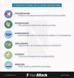 | Keywords: buzz marketing viral viralidad comunicacion comunicar screenshot text infografia marketing buzz viral viralidad comunicacion campaña vender 6 Puntos clave en el Buzz Marketing Para ver el artículo entero neoattack.com/buzz-marketing-definicion-concepto-y-ejemplos/ Para conseguir una viralización de nuestro producto a través del boca a boca debemos tener en cuenta los siguientes puntos. 1) Comunicación: Nuestro medio de comunicación es el consumidor, por lo que debemos enfocar toda nuestra estrategia de comunicación en él. 2) Satisfacción: El grado de satisfacción del consumidor debe ser muy elevado para que este se convierta en “evangelista”, así que si tu producto no es netamente superior en algún aspecto, esta estrategia es probable que no funcione. 3) Superioridad: Tu producto será evangelizado cuando supere en algo claramente a la competencia. Normalmente ese algo será el precio o la calidad del producto, pero existen muchas formas de superar a tu competencia. Si quieres conocerlas te recomiendo leer “Estrategias de venta: Como superar a tu competencia” 4) Viralización: El Buzz Marketing no es incompatible con los referenciadores, influencers, el endorsement o la publicidad en general. De hecho, apoyar tu campaña de Buzz Marketing con estas técnicas de marketing te ayudará a viralizar tu producto más rápidamente. 5) Internet: Como recomendación, enfócate más en internet y los medios online (bloggers, redes sociales, publicidad online…) para dar ese empujón a tu Buzz Marketing. Internet y el marketing viral están tan relacionados que sin estrategia online nunca llegará la viralización, y si llega no tendrás estrategia para controlarla y aprovecharte al máximo de ella. 6) Medición: Al igual que en cualquier otra campaña debes medir con tus herramientas de monitorización lo que está sucediendo para saber cómo está funcionando tu estrategia, si debes cambiar algo, que acciones potenciar, etc. 6 Puntos clave en el Buzz Marketing Para ver el artículo entero neoattack.com/buzz-marketing-definicion-concepto-y-ejemplos/ Para conseguir una viralización de nuestro producto a través del boca a boca debemos tener en cuenta los siguientes puntos. 1) Comunicación: Nuestro medio de comunicación es el consumidor, por lo que debemos enfocar toda nuestra estrategia de comunicación en él. 2) Satisfacción: El grado de satisfacción del consumidor debe ser muy elevado para que este se convierta en “evangelista”, así que si tu producto no es netamente superior en algún aspecto, esta estrategia es probable que no funcione. 3) Superioridad: Tu producto será evangelizado cuando supere en algo claramente a la competencia. Normalmente ese algo será el precio o la calidad del producto, pero existen muchas formas de superar a tu competencia. Si quieres conocerlas te recomiendo leer “Estrategias de venta: Como superar a tu competencia” 4) Viralización: El Buzz Marketing no es incompatible con los referenciadores, influencers, el endorsement o la publicidad en general. De hecho, apoyar tu campaña de Buzz Marketing con estas técnicas de marketing te ayudará a viralizar tu producto más rápidamente. 5) Internet: Como recomendación, enfócate más en internet y los medios online (bloggers, redes sociales, publicidad online…) para dar ese empujón a tu Buzz Marketing. Internet y el marketing viral están tan relacionados que sin estrategia online nunca llegará la viralización, y si llega no tendrás estrategia para controlarla y aprovecharte al máximo de ella. 6) Medición: Al igual que en cualquier otra campaña debes medir con tus herramientas de monitorización lo que está sucediendo para saber cómo está funcionando tu estrategia, si debes cambiar algo, que acciones potenciar, etc. neoattack.com/buzz-marketing-definicion-concepto-y-ejemplos/ 6 Puntos clave en el Buzz Marketing Para conseguir una viralización de nuestro producto a través del boca a boca debemos tener en cuenta los siguientes puntos. 1) Comunicación: Nuestro medio de comunicación es el consumidor, por lo que debemos enfocar toda nuestra estrategia de comunicación en él. 2) Satisfacción: El grado de satisfacción del consumidor debe ser muy elevado para que este se convierta en “evangelista”, así que si tu producto no es netamente superior en algún aspecto, esta estrategia es probable que no funcione. 3) Superioridad: Tu producto será evangelizado cuando supere en algo claramente a la competencia. Normalmente ese algo será el precio o la calidad del producto, pero existen muchas formas de superar a tu competencia. Si quieres conocerlas te recomiendo leer “Estrategias de venta: Como superar a tu competencia” 4) Viralización: El Buzz Marketing no es incompatible con los referenciadores, influencers, el endorsement o la publicidad en general. De hecho, apoyar tu campaña de Buzz Marketing con estas técnicas de marketing te ayudará a viralizar tu producto más rápidamente. 5) Internet: Como recomendación, enfócate más en internet y los medios online (bloggers, redes sociales, publicidad online…) para dar ese empujón a tu Buzz Marketing. Internet y el marketing viral están tan relacionados que sin estrategia online nunca llegará la viralización, y si llega no tendrás estrategia para controlarla y aprovecharte al máximo de ella. 6) Medición: Al igual que en cualquier otra campaña debes medir con tus herramientas de monitorización lo que está sucediendo para saber cómo está funcionando tu estrategia, si debes cambiar algo, que acciones potenciar, etc. neoattack.com/buzz-marketing-definicion-concepto-y-ejemplos/ 6 Puntos clave en el Buzz Marketing Para conseguir una viralización de nuestro producto a través del boca a boca debemos tener en cuenta los siguientes puntos. 1) Comunicación: Nuestro medio de comunicación es el consumidor, por lo que debemos enfocar toda nuestra estrategia de comunicación en él. 2) Satisfacción: El