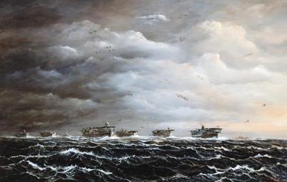 Keywords: cloud outdoor sky wave water sea 80-142-H: Japanese Attack on Pearl Harbor, December 7, 1941. Imperial Japanese Navy aircraft carriers in dawn fly-off for Pearl Harbor. Artwork by John Hamilton from his publication, “War at Sea,” pg. 68-69. Courtesy of the U.S. Navy Art Gallery. 80-142-H: Japanese Attack on Pearl Harbor, December 7, 1941. Imperial Japanese Navy aircraft carriers in dawn fly-off for Pearl Harbor. Artwork by John Hamilton from his publication, “War at Sea,” pg. 68-69. Courtesy of the U.S. Navy Art Gallery. |