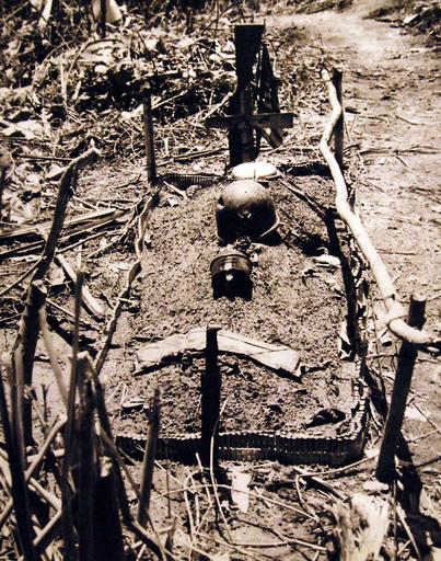 | Keywords: outdoor texture photo border 80-G-207839: Machine-gun bullets, outline grave of Marine paratrooper buried on the spot where he was killed on Hallzapoppin Ridge, Bougainville. Near the crude cross marking, the grave is a flag and rifle. A bullet-ridden helmet and mess gear are also on the grave. Photograph released January 14, 1944. U.S. Navy photograph, now in the collections of the National Archives. (2016/06/21). 80-G-207839: Machine-gun bullets, outline grave of Marine paratrooper buried on the spot where he was killed on Hallzapoppin Ridge, Bougainville. Near the crude cross marking, the grave is a flag and rifle. A bullet-ridden helmet and mess gear are also on the grave. Photograph released January 14, 1944. U.S. Navy photograph, now in the collections of the National Archives. (2016/06/21). |