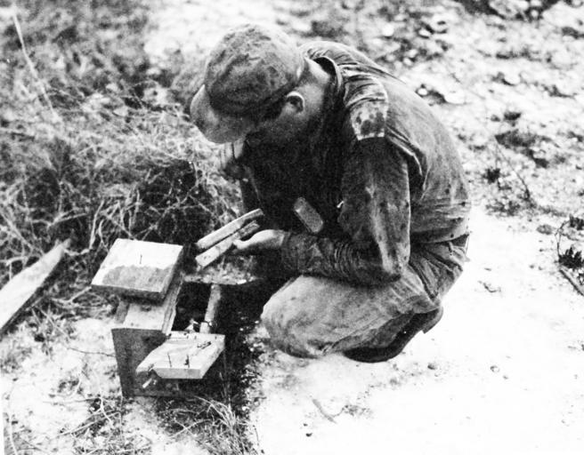 Keywords: blackandwhite monochrome outdoor black and white 80-G-259270: Japanese land mine consisting of a wooden box containing dynamite and detonator with weight suspended over explosive. This trap was installed in ruined building some distance from a Japanese pillbox, in the vicinity of Iloilo Harbor, Panay, Philippines Photographed by Lieutenant Junior Grade C.F. Waterman, CPU-8, March, 22, 1945. (5/26/2015). 80-G-259270: Japanese land mine consisting of a wooden box containing dynamite and detonator with weight suspended over explosive. This trap was installed in ruined building some distance from a Japanese pillbox, in the vicinity of Iloilo Harbor, Panay, Philippines Photographed by Lieutenant Junior Grade C.F. Waterman, CPU-8, March, 22, 1945. (5/26/2015). |