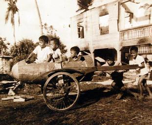 Keywords: vehicle bike monochrome outdoor 80-G-320624: A Japanese bomber’s belly tank is mounted on wheels and used as a plaything by Guam children. The smiling youngsters are playing amid the ruins of Agana destroyed in fierce fighting between American and Japanese forces for possession of the island. Photographed May 12, 1945. Official U.S. Navy Photograph, now in the collections of the National Archives. (2016/07/05) 80-G-320624: A Japanese bomber’s belly tank is mounted on wheels and used as a plaything by Guam children. The smiling youngsters are playing amid the ruins of Agana destroyed in fierce fighting between American and Japanese forces for possession of the island. Photographed May 12, 1945. Official U.S. Navy Photograph, now in the collections of the National Archives. (2016/07/05) |