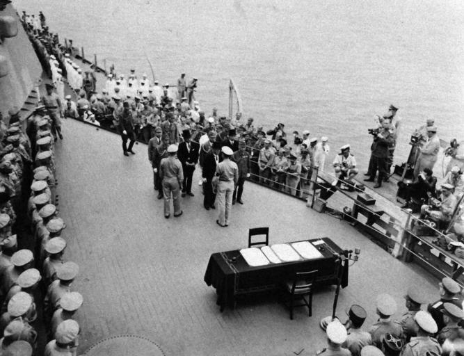 | Keywords: blackandwhite monochrome snow black and white 80-G-332667:  Surrender of Japan, Tokyo Bay, 2 September 1945.  Arrival of Japanese emissaries onboard USS Missouri (BB 63).  Though grainy, Foreign Minister Mamoru Shigemitsu (wearing top hat) and General Yoshijiro Umezu, Chief of the Army General Staff can be seen in the center.  High ranking officers of Allied nations are in lower right; and those of US are at left. Photographed by PHOM1/C James M. Mull.  U.S. Navy photograph, now in the collections of the National Archives.    (2015/11/17). Note, the original is a very small photograph.    80-G-332667:  Surrender of Japan, Tokyo Bay, 2 September 1945.  Arrival of Japanese emissaries onboard USS Missouri (BB 63).  Though grainy, Foreign Minister Mamoru Shigemitsu (wearing top hat) and General Yoshijiro Umezu, Chief of the Army General Staff can be seen in the center.  High ranking officers of Allied nations are in lower right; and those of US are at left. Photographed by PHOM1/C James M. Mull.  U.S. Navy photograph, now in the collections of the National Archives.    (2015/11/17). Note, the original is a very small photograph. |