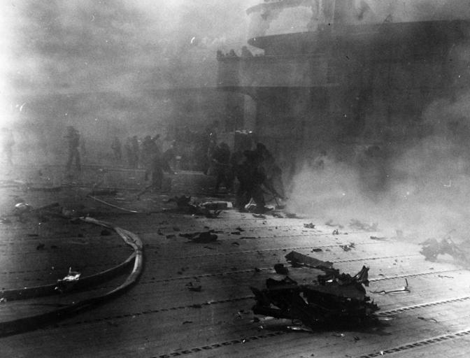 | Keywords: blackandwhite monochrome outdoor sky black and white 80-G-40301:  Battle of the Santa Cruz Islands, October 1942.  Fire-fighting crews try to extinguish flames on board USS Hornet (CV-8) after it was struck by a crashing Japanese dive bomber, during the morning of 26 October 1942.  Hornet sunk later that day.   (2015/10/20). 80-G-40301:  Battle of the Santa Cruz Islands, October 1942.  Fire-fighting crews try to extinguish flames on board USS Hornet (CV-8) after it was struck by a crashing Japanese dive bomber, during the morning of 26 October 1942.  Hornet sunk later that day.   (2015/10/20).  |
