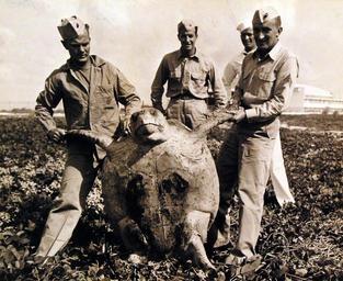Keywords: outdoor 80-G-414026: Naval Air Station, Banana River, Florida. Private First Class W. J. Gardner, USMC; Sergeant Harry Shult, USMC; R. Turner, USN and Sergeant Greco, USMC, with sea turtle on beach. Photograph released June 4, 1945. Official U.S. Navy photograph, now in the collections of the National Archives. (2016/11/15). 80-G-414026: Naval Air Station, Banana River, Florida. Private First Class W. J. Gardner, USMC; Sergeant Harry Shult, USMC; R. Turner, USN and Sergeant Greco, USMC, with sea turtle on beach. Photograph released June 4, 1945. Official U.S. Navy photograph, now in the collections of the National Archives. (2016/11/15). |