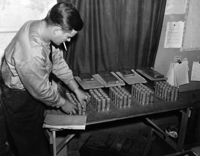 Keywords: blackandwhite monochrome indoor black and white 80-G-44615 (TR-7039): Colors in cartridges – Air Intelligence Officer, Lieutenant Junior Grade Samuel D. Trusty prepares recognition flares, which are fired from very pistols (flare guns) in various color combinations according to code. Photograph released February 7, 1944. (2015/12/01). 80-G-44615 (TR-7039): Colors in cartridges – Air Intelligence Officer, Lieutenant Junior Grade Samuel D. Trusty prepares recognition flares, which are fired from very pistols (flare guns) in various color combinations according to code. Photograph released February 7, 1944. (2015/12/01). |