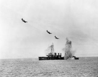| Keywords: blackandwhite monochrome outdoor black and white 80-G-702830: Ex-USS Stewart (DD-224). Under attack while being sunk as a target on 24 May 1946. Airplanes seen include an F4U "Corsair" in the lead, followed by two F6F "Hellcats". Their steep angle of approach so close to the surface, and close spacing between them, strongly indicates that this is a composite photograph. The Japanese flag painted amidships reflects Stewart's 1943-1945 service as the Japanese Navy's Patrol Boat 102. She was recovered by the U.S. Navy after the end of World War II and recommissioned as USS DD-224 for the voyage back to the United States. Official U.S. Navy Photograph, now in the collections of the National Archives. 80-G-702830: Ex-USS Stewart (DD-224). Under attack while being sunk as a target on 24 May 1946. Airplanes seen include an F4U "Corsair" in the lead, followed by two F6F "Hellcats". Their steep angle of approach so close to the surface, and close spacing between them, strongly indicates that this is a composite photograph. The Japanese flag painted amidships reflects Stewart's 1943-1945 service as the Japanese Navy's Patrol Boat 102. She was recovered by the U.S. Navy after the end of World War II and recommissioned as USS DD-224 for the voyage back to the United States. Official U.S. Navy Photograph, now in the collections of the National Archives. |