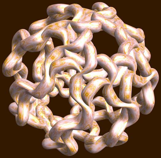 | Keywords: mathematica 3d cg parametricplot3d texture torus 輪環 りんかん ドーナツ どーなつ 八芒星 はちぼうせい 八光星 はちこうせい 八稜星 はちりょうせい code program algorithm コード プログラム アルゴリズム geometric sculpture geometricsculpture shape geometry sculpture mapping テクスチャ マッピング 模様 もよう abstract 抽象 ちゅうしょう アブストラクト design pattern デザイン パターン graphic グラフィック グラフィクス structure 意匠 構造 symmetry 対称性 たいしょうせい シンメトリー 対称 たいしょう algorithm コード black background indoor food a = 12; (* center hole size of a torus *) b = 8; (* octa-torus *) c = -16; (* distance from the center of rotation *) d = 8; (* number of torus *) h = 1; (* height of a torus *) SetOptions[ParametricPlot3D, PlotRange -> Full, Mesh -> None, Boxed -> False, Axes -> False, PlotPoints -> 400, ImageSize -> 3000, Background -> Darker[Orange, 0.8], PlotStyle -> Directive[Specularity[White, 30], Texture[Import["D:/tmp/861.jpg"]]], TextureCoordinateFunction -> ({#4, #5 2 Pi} &), Lighting -> "Neutral"]; f[v_] := Sin[2 Sin[Sin[Sin[v]]]]; x = (a - Cos[t] - f[b s]) Cos[s + Pi/b]; y = (a - Cos[t] - f[b s]) Sin[s + Pi/b]; z = (a - Sin[t] - h f[b s]) + c; rm = Table[{x, y, z}.RotationMatrix[2 i Pi/d, {1, 1, 0}], {i, d}]; ParametricPlot3D[rm, {t, 0, 2 Pi}, {s, 0, 2 Pi}] (*--- The Texture *) a = 12; (* center hole size of a torus *) b = 8; (* octa-torus *) c = -16; (* distance from the center of rotation *) d = 8; (* number of torus *) h = 1; (* height of a torus *) SetOptions[ParametricPlot3D, PlotRange -> Full, Mesh -> None, Boxed -> False, Axes -> False, PlotPoints -> 400, ImageSize -> 3000, Background -> Darker[Orange, 0.8], PlotStyle -> Directive[Specularity[White, 30], Texture[Import["D:/tmp/861.jpg"]]], TextureCoordinateFunction -> ({#4, #5 2 Pi} &), Lighting -> "Neutral"]; f[v_] := Sin[2 Sin[Sin[Sin[v]]]]; x = (a - Cos[t] - f[b s]) Cos[s + Pi/b]; y = (a - Cos[t] - f[b s]) Sin[s + Pi/b]; z = (a - Sin[t] - h f[b s]) + c; rm = Table[{x, y, z}.RotationMatrix[2 i Pi/d, {1, 1, 0}], {i, d}]; ParametricPlot3D[rm, {t, 0, 2 Pi}, {s, 0, 2 Pi}] (*--- The Texture *) |
