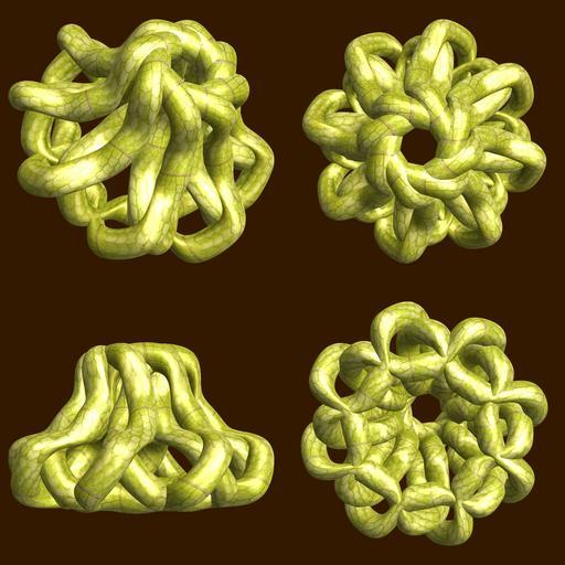 | Keywords: mathematica 3d cg parametricplot3d texture torus 輪環 りんかん ドーナツ どーなつ 三芒星 さんぼうせい 三光星 さんこうせい 三稜星 さんりょうせい code program algorithm コード プログラム アルゴリズム geometric sculpture geometricsculpture shape geometry sculpture mapping テクスチャ マッピング 模様 もよう abstract 抽象 ちゅうしょう アブストラクト design pattern デザイン パターン graphic グラフィック グラフィクス structure 意匠 構造 symmetry 対称性 たいしょうせい シンメトリー 対称 たいしょう algorithm コード indoor organic pattern bright black background a = 5; (* center hole size of a torus *) b = 3; (* tri-torus *) c = 1; (* distance from the center of rotation *) d = 8; (* number of torus *) h = 1; (* height of a torus *) SetOptions[ParametricPlot3D, PlotRange -> Full, Mesh -> None, Boxed -> False, Axes -> False, PlotPoints -> 400, ImageSize -> 1600, Background -> Darker[Orange, 0.8], PlotStyle -> Directive[Specularity[White, 30], Texture[Import["D:/tmp/71.jpg"]]], TextureCoordinateFunction -> ({#4 , #5 2 Pi} &), Lighting -> "Neutral"]; f[v_] := Sin[2 Sin[Sin[Sin[v]]]]; x = (a - Cos[t] - f[b s]) Cos[s] + c; y = (a - Cos[t] - f[b s]) Sin[s] + c; z = (a - Sin[t] - h f[b s]); rot = Table[{x, y, z}.RotationMatrix[2 i Pi/d, {0, 2, 1}], {i, d}]; ParametricPlot3D[rot, {t, 0, 2 Pi}, {s, 0, 2 Pi}] (*--- The Texture is this: www.flickr.com/photos/tanaka_juuyoh/5239255695/ *) a = 5; (* center hole size of a torus *) b = 3; (* tri-torus *) c = 1; (* distance from the center of rotation *) d = 8; (* number of torus *) h = 1; (* height of a torus *) SetOptions[ParametricPlot3D, PlotRange -> Full, Mesh -> None, Boxed -> False, Axes -> False, PlotPoints -> 400, ImageSize -> 1600, Background -> Darker[Orange, 0.8], PlotStyle -> Directive[Specularity[White, 30], Texture[Import["D:/tmp/71.jpg"]]], TextureCoordinateFunction -> ({#4 , #5 2 Pi} &), Lighting -> "Neutral"]; f[v_] := Sin[2 Sin[Sin[Sin[v]]]]; x = (a - Cos[t] - f[b s]) Cos[s] + c; y = (a - Cos[t] - f[b s]) Sin[s] + c; z = (a - Sin[t] - h f[b s]); rot = Table[{x, y, z}.RotationMatrix[2 i Pi/d, {0, 2, 1}], {i, d}]; ParametricPlot3D[rot, {t, 0, 2 Pi}, {s, 0, 2 Pi}] (*--- The Texture is this: www.flickr.com/photos/tanaka_juuyoh/5239255695/ *) |