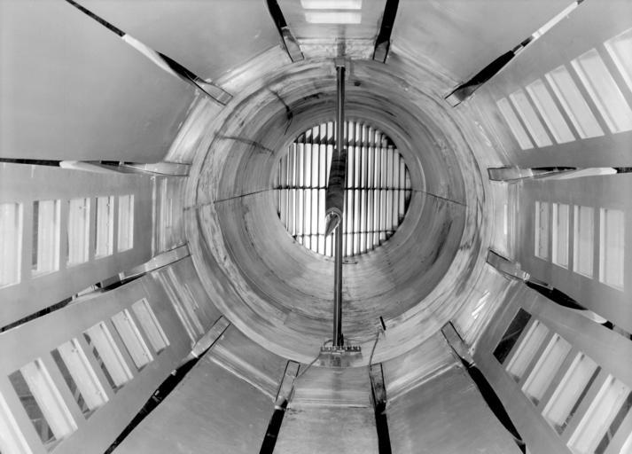 Keywords: blackandwhite monochrome symmetry architecture black and white (1957-L-00959): The later slotted-wall test section of the 8-Foot HST. Note the curved re-entry baffle at the end of each slot and the turning vanes in the background. The turning vanes were original equipment. (1957-L-00959): The later slotted-wall test section of the 8-Foot HST. Note the curved re-entry baffle at the end of each slot and the turning vanes in the background. The turning vanes were original equipment. |