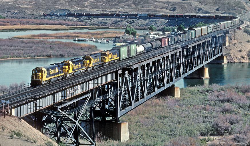 | Keywords: santa fe santafe at&sf atsf outdoor vehicle train railroad architecture building structure infrastructure building Roger Puta took these in January 1983 at the AT&SF Colorado River Bridge. The River is the Arizona/California border. He was on a hill in California where he could look at the bridge and across to Arizona and shoot westbounds ore he could turn around looking toward Needles, CA and shoot eastbounds. This sequence has one eastbound and three westbounds. 7. and 8. AT&SF C30-7 8132 westbound also with a merchandise freight train. Too bad the two GEs didn't meet on the bridge. Roger Puta took these in January 1983 at the AT&SF Colorado River Bridge. The River is the Arizona/California border. He was on a hill in California where he could look at the bridge and across to Arizona and shoot westbounds ore he could turn around looking toward Needles, CA and shoot eastbounds. This sequence has one eastbound and three westbounds. 7. and 8. AT&SF C30-7 8132 westbound also with a merchandise freight train. Too bad the two GEs didn't meet on the bridge. |