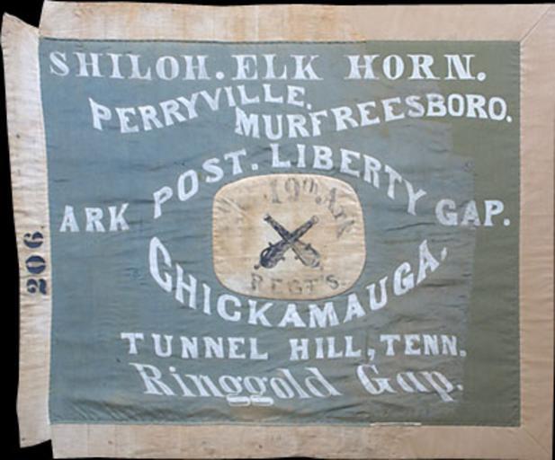 Keywords: 8th and 19th Combined Arkansas Infantry Regiment.jpg en Flag of the 8th and 19th Consolidated Arkansas Infantry Regiments Flag is another example of the 1864 issue of Hardee flags This was produced and decorated specifically for the combined unit displaying battle honors of each The poorly dyed blue field now faded to pea green is typical of the 1864 flags When it was captured at Jonesboro Georgia on 1 September 1864 the flag was identified as that of an artillery battery The honor of crossed cannon as well as the unit's position supporting Key's Battery caused the confused attribution Hardee Battle flag pattern Cleburne's Division 1864 issue Cotton with black and white paint 35 x 34 1/2 remaining War Department Capture Number 206 Currently located at the Old State House Museum Little Rock Arkanas 2011-10-20 http //www oldstatehouse com/collections/flags/flagDetail asp g 3 img 4 Confederate Army 1864 PD-Art Uploaded with UploadWizard Arkansas in the American Civil War Army flags of the Confederate States of America Military in Arkansas |