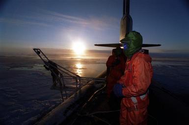 Keywords: 961105-N-4482V-012 Arctic Submarine Mission.jpg en 961105-N-4482V-012 During an Arctic sunrise on board the U S Navy s attack submarine USS Pogy SSN 647 Jay Simpkins far left a scientist with the Oregon State University collects water samples while Navy Lieutenant Junior Grade Mark Cronley foreground stands watch as a safety observer on boats deck The second of five planned deployments through the year 2000 Pogy embarked a team of researchers led by Mr Ray Sambrotto of Columbia University During the several thousand mile trek the submarine collected data on the chemical biological and physical properties of the Arctic Ocean and conducted experiments in geophysics ice mechanics pollution detection and other areas For the purposes of this voyage a portion of the submarine s torpedo room was converted into laboratory space However at no time was the ship ever removed as a front-line warship U S Navy Photo by Photographer s Mate Second Class Steven H Vanderwerff Released 961105-N-4482V-012 Navy http //www navy mil/view_image asp id 425 U S Navy Photo by Photographer s Mate Second Class Steven H Vanderwerff PD-USGov-Military-Navy USS Pogy SSN-647 |