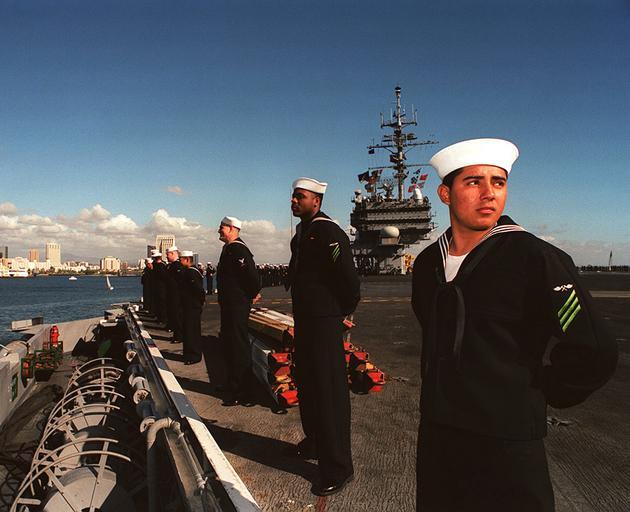Keywords: 970401-N-4126O-001 Manning the Rails.jpg en 970401-N-4126O-001 Aboard the aircraft carrier USS Constellation CV 64 departing San Diego harbor April 1 1997 Aviation Mechanic Hydraulics Airman Nelson Egardo Castro-Aguilar right from Alexandria Virginia gazes seaward as USS Constellation CV 64 departs its home port of San Diego California The ship and its battle group will head to the Arabian Gulf to enforce no fly zones over Iraq and monitor shipping to and from region U S Navy photograph by Photographer s Mate 3rd Class James W Olive RELEASED 1997-04-01 970401-N-4126O-001 Navy http //www navy mil/view_image asp id 439 Photographer ™s Mate 3rd Class James W Olive USN PD-USGov-Military-Navy Manning the rail in the United States Navy USS Constellation CV-64 flight deck Sailor caps of the United States Navy 1997 photographs Military people in 1997 1997 in California April 1997 in the United States 1 April Naval ship departures from Naval Air Station North Island Male soldiers Men facing left and looking right Sailor suits Sailor collars |