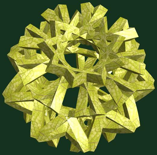 | Keywords: mathematica 3d cg parametricplot3d texture torus code program algorithm プログラム コード アルゴリズム 輪環 りんかん ドーナツ どーなつ 八芒星 はちぼうせい geometric sculpture geometricsculpture shape geometry sculpture mapping テクスチャ マッピング 模様 もよう abstract 抽象 ちゅうしょう アブストラクト design pattern デザイン パターン graphic グラフィック グラフィクス structure 意匠 構造 symmetry 対称性 たいしょうせい シンメトリー 対称 たいしょう organic pattern foliage plant leaf outdoor tree black background a = 8; (* center hole size *) b = 8; (* octa-torus *) c = -5; (* distance from the center of rotation *) d = 9; (* number of torus *) h = 2; (* height of a torus *) SetOptions[ParametricPlot3D, PlotRange -> Full, Mesh -> None, Boxed -> False, Axes -> False, PlotPoints -> 400, ImageSize -> 3000, Background -> RGBColor[{20, 50, 30}/255], PlotStyle -> Directive[Specularity[White, 30], Texture[Import["D:/tmp/71.jpg"]]], TextureCoordinateFunction -> ({#4, #5 Pi} &), Lighting -> "Neutral"]; f[v_] := TriangleWave[{-1, 1}, v/(2 Pi)]; g[v_] := TriangleWave[{-1, 1}, v/(2 Pi) + 1/4]; x = (a - g[t] - f[b s]) Cos[s + Pi/(2 b)]; y = (a - g[t] - f[b s]) Sin[s + Pi/(2 b)]; z = (a - f[t] - h f[b s]) + c; rm = Table[{x, y, z}.RotationMatrix[2 i Pi/d, {1, 1, 0}], {i, d}]; ParametricPlot3D[rm, {t, 0, 2 Pi}, {s, 0, Pi}] (*--- The Texture *) a = 8; (* center hole size *) b = 8; (* octa-torus *) c = -5; (* distance from the center of rotation *) d = 9; (* number of torus *) h = 2; (* height of a torus *) SetOptions[ParametricPlot3D, PlotRange -> Full, Mesh -> None, Boxed -> False, Axes -> False, PlotPoints -> 400, ImageSize -> 3000, Background -> RGBColor[{20, 50, 30}/255], PlotStyle -> Directive[Specularity[White, 30], Texture[Import["D:/tmp/71.jpg"]]], TextureCoordinateFunction -> ({#4, #5 Pi} &), Lighting -> "Neutral"]; f[v_] := TriangleWave[{-1, 1}, v/(2 Pi)]; g[v_] := TriangleWave[{-1, 1}, v/(2 Pi) + 1/4]; x = (a - g[t] - f[b s]) Cos[s + Pi/(2 b)]; y = (a - g[t] - f[b s]) Sin[s + Pi/(2 b)]; z = (a - f[t] - h f[b s]) + c; rm = Table[{x, y, z}.RotationMatrix[2 i Pi/d, {1, 1, 0}], {i, d}]; ParametricPlot3D[rm, {t, 0, 2 Pi}, {s, 0, Pi}] (*--- The Texture *) |