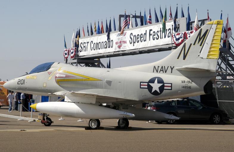 Keywords: A-4C VA-192 CVW-19 display.jpg A Douglas A-4C Skyhawk on display at the main entrance of the 2006 Coronado Classic Speed Festival The festival held 7/8 October 2006 featured more than 225 of the world's top vintage racing machines competing for honors on a 1 6-mile 3 2 km race course built on the runways and taxiways of Naval Air Station North Island California USA The plane is BuNo 148516 painted in the colours of attack squadron VA-192 Golden Dragons which made four deployments flying the A-4C as part of Attack Carrier Air Group Nineteen CVW-19 tail code NM aboard the aircraft carrier USS Bon Homme Richard CVA-31 between April 1961 and January 1966 Before 1963 the A-4C was designated A4D-2N and before December of the same year the Carrier Air Wing had been designated Carier Air Group CVG Official U S Navy photo 061008-N-7899V-001 http //www news navy mil/management/photodb/photos/061008-N-7899V-001 jpg 2006-10-08 Mass Communication Specialist 2nd Class Susan Van Veen PD-USGov-Military-Navy Douglas A-4C Skyhawk museum aircraft Strike Fighter Squadron 192 United States Navy |