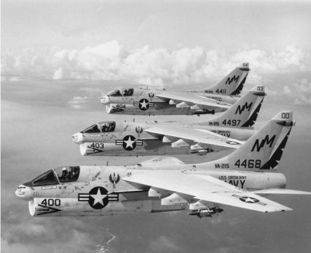 | Keywords: A-7B VA215 CVA-34.jpg Three Vought A-7B Corsair II BuNos 154411 154468 and 154497 from attack squadron VA-215 Barn Owls Attack Carrier Air Wing Nineteen CVW-19 in 1972 VA-215 was deployed aboard the aircraft carrier USS Oriskany CVA-34 from 1971 to 1976 U S Naval History Center Dictionary of American Naval Aviation Squadrons Volume 1 The History of VA VAH VAK VAL VAP and VFA Squadrons Chapter 2 Attack Squadron Histories for VA-210 to VA-873 p 284 http //www history navy mil/download/va210873 pdf; http //collections naval aviation museum/emuwebdoncoms/pages/doncoms/AdvQuery php U S Navy National Museum of Naval Aviation photo No http //collections naval aviation museum/emuwebdoncoms/pages/doncoms/Display php irn 12609 QueryPage 2Femuwebdoncoms 2Fpages 2Fdoncoms 2FAdvQuery php 1996 253 7110 020 1972 USN PD-USGov-Military-Navy A-7B Corsair II Attack Squadron 215 United States Navy 1972 in aviation |