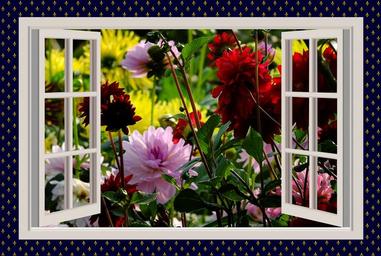 | Keywords: a beautiful day good mood joy dahlias flowers window summer midsummer late summer summer flowers colorful flowers red flowers a beautiful morning garden red dahlias outlook window frames open colorful farbenpracht horticulture benefit from photo montage |