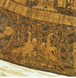 | Keywords: A bird-couple on the edge of the coronation pall.jpg author 1031 textile embroidery Institution Hungarian National Museum Budapest object history credit line accession number own scanned by Szilas from A magyar Szent Korona by Tóth Endre Szelényi Károly Kossuth 2000 Budapest PD-old-100 Coronation pall of Hungary |