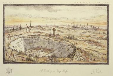 Keywords: A Cemetery on Vimy Ridge - Frederick Thwaites Bush.jpg This sketch depicts a memorial at the bottom of a shell crater for fallen soldiers of the 2nd Canadian Division during the Battle of Vimy Ridge ink paper cm 28 6 39 7 Institution Canadian War Museum Beaverbrook Collection of War Art Printed in England en top left The Fine Arts Publishing Company Limited Copyright London top right en copyright A Cemetary on Vimy Ridge; F T Bush; F T Bush 1917 bottom en caption http //www civilization ca/cwm/exhibitions/guerre/photos/2800/19710261-0116 jpg accession number 19710261-0116 Credit line 1917 PD-Art Other versions derivative works A Cemetery on Vimy Ridge - detail jpg Paintings of the Battle of Vimy Ridge Drawings in the Canadian War Museum Drawings from the Canadian War Memorials Fund Beaverbrook Collection of War Art