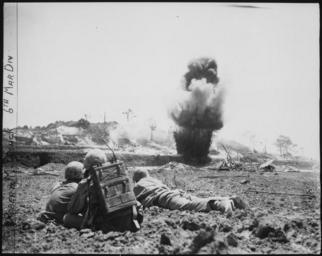 Keywords: A demolition crew from the 6th Marine Division watch dynamite charges explode and destroy a Japanese cave. Okinawa... - NARA - 532557.tif Scope and content General notes Use War and Conflict Number 1227 when ordering a reproduction or requesting information about this image 532557 Local identifier 127-N-122154 Department of Defense Department of the Navy U S Marine Corps 09/18/1947 - Still Picture Records Section Special Media Archives Services Division NWCS-S National Archives at College Park 8601 Adelphi Road College Park MD 20740-6001 1927 - 1981 Record group Record Group 127 Records of the U S Marine Corps 1775 - 9999 Record group ARC 456 General Photograph File of the U S Marine Corps compiled 1927 - 1981 documenting the period 1775 - 1981 Series ARC 532396 File unit File unit ARC Variant control numbers NAIL Control Number NWDNS-127-N-122154 yes Other versions NARA-cooperation PD-USGov 6th Marine Division United States in World War II Battle of Okinawa |