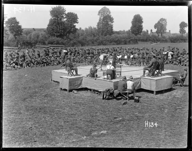 Keywords: blackandwhite monochrome outdoor photo border black and white Fighting in the ring at the Divisional boxing championships in Doulieu, France. Long view showing the boxing ring, judges and spectators. Photograph taken 6 or 10 July 1917 by Henry Armytage Sanders. Inscriptions: Inscribed - Photographer's title on negative -bottom right: H134. Quantity: 1 b&w original negative(s). Physical Description: Dry plate glass negative 4 x 5 inches A fight underway at the New Zealand Division boxing championships in France during World War I. Royal New Zealand Returned and Services' Association :New Zealand official negatives, World War 1914-1918. Ref: 1/2-012844-G. Alexander Turnbull Library, Wellington, New Zealand. natlib.govt.nz/records/22314487 Fighting in the ring at the Divisional boxing championships in Doulieu, France. Long view showing the boxing ring, judges and spectators. Photograph taken 6 or 10 July 1917 by Henry Armytage Sanders. Inscriptions: Inscribed - Photographer's title on negative -bottom right: H134. Quantity: 1 b&w original negative(s). Physical Description: Dry plate glass negative 4 x 5 inches A fight underway at the New Zealand Division boxing championships in France during World War I. Royal New Zealand Returned and Services' Association :New Zealand official negatives, World War 1914-1918. Ref: 1/2-012844-G. Alexander Turnbull Library, Wellington, New Zealand. natlib.govt.nz/records/22314487 |