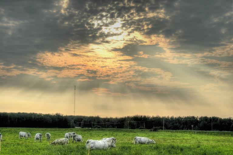 Keywords: sunbeam herd sky pale cattle grazing green Mulhurst Bay field Alberta Canada