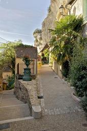 Keywords: street lane under cliff Les Eyzies-de-Tayac Dordogne France morning