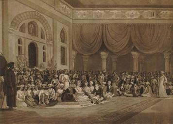Keywords: A large room with corinthian columns and swags of cloth.jpg A large room with corinthian columns and swags of cloth where Indian and European men nobles and soldiers are gathered watching Sir Charles Warre Malet hand a scrolled paper to the Indian ruler sitting in the centre; a shrine with a statue of Ganesh arched windows and niches other statues of Hindhu deities in the wall to left; after Daniell; unfinished proof before margin fully cleared Mezzotint with etching 1807 http //www britishmuseum org/research/search_the_collection_database/search_object_details aspx objectid 3428431 partid 1 searchText ganesh fromADBC ad toADBC ad numpages 10 images on orig 2fresearch 2fsearch_the_collection_database aspx currentPage 2 A Representation of the delivery of the Ratified Treat of 1790 by Sir Chas Warre Malet Bart to his Highness Soneae Madarou Peshwa in full Durbar or Court as held upon that occasion at Poonah in the East INdies on the 6th July 1790 in collection database of British Museum Thomas Daniell <br> Print Charles Turner PD-old-100 other versions PD-old-100 Original upload log page te wikipedia AN01128976_001_l jpg Upload date User Bytes Dimensions Comment 2012-02-28 10 12 49 Sridhar1000 99595 750×539 <small><nowiki> A large roomw ith corinthian columns and swags of cloth where Indian and European men nobles and soldiers are gathered watching Sir Charles Warre Malet hand a scrolled paper to the Indian ruler sitting i</nowiki></small> Madhav Rao II |