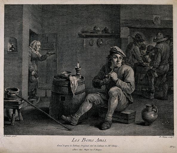 Keywords: A man sits by a barrel-table smoking his pipe, behind others Wellcome V0019040.jpg Artwork Creator David Teniers II A man sits by a barrel-table smoking his pipe behind others play cards and a woman enters the room Engraving by P Chenu after D Teniers <p>Iconographic Collections<br> Keywords David Teniers; Pierre Chenu Library reference ICV No 19433 Photo number V0019040 Full Bibliographic Record http //catalogue wellcomelibrary org/record b1182569 object history exhibition history credit line Wellcome Images http //wellcomeimages org/indexplus/obf_images/53/b8/384167df7ab3f3b4a3df65e27f5b jpg Gallery http //wellcomeimages org/indexplus/image/V0019040 html accession number PD-old-auto-1923 1795 Images uploaded by Fæ Wellcome V0019040 jpg Files from Wellcome Images check needed V0019040 jpg Works after David Teniers the Younger Pierre Chenu