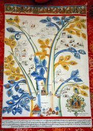 | Keywords: A Medical Thangka - Root of Treatment.jpg en This painting illustrates a general overview of the treatment process as it is outlined in the Root Tantra Treatment can begin after humoural imbalance has been assessed through the diagnosis process tk 3 The four trunks of the tree from left to right correspond respectively to counsel on diet guidance on conduct appropriate medicinal treatments and external physical therapies For the sake of an example this presentation will go in-depth on counsel of diet and examine the role that the three humors play in this treatment The dietary trunk of the treatment thangka diverges into six blue yellow and white branches Each colour indicates the humoral imbalance to which it relates The blue branches correspond to food and drink which balance rlung wind These foods are generally oily and nutritious foods Seed oil garlic and human donkey marmot and horse flesh are some of foods shown in the rlung leaves The yellow branches depict food and drink to alleviate mkhris-pa bile imbalance Generally these foods are cool and light Fresh butter dandelion leaves and seeds warm water and goat veal and deer meat are all shown on the yellow leaves Finally the white leaves and branches illustrate food and drink for bad-kan phlegm imbalance which is rebalanced through the application of a warming diet Honey boiled water fish mutton and beast and yak meat are shown on the white leaves indicating their bad-kan balancing properties In total there are six branches with 35 leaves on the dietary trunk of the treatment tree each illustrating a food or drink used for rebalancing the humors Sources and Further Reading Averdon pg 110 Old pg 75-78 Gyurme Dorje Sangye Gyamtso 1653-1705 PD-old-100 Medical thangka from Tibet |
