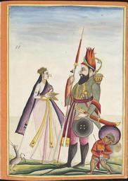 Keywords: A Mughal warrior and his wife.jpg This is a page from the Boileau Album The album contains 42 Company paintings probably made by an artist from Thanjavur Tanjore living in Madras Painting in Madras at this early period appears to have been linked mainly to individual patronage John Peter Boileau commissioned this album Boileau whose ancestors were French served as a member of the Madras Civil Service from 1765 to 1785 He probably had the album made to take back home to England when he retired circa 1785 painted Opaque watercolour on paper Height 36 8 cm Width 27 cm Taken from Arts of India 1550-1900 Institution Victoria and Albert Museum Archer Mildred Company Paintings Indian Paintings of the British period Victoria and Albert Museum Indian Series London Victoria and Albert Museum Maplin Publishing 1992 37 p ISBN 0944142303 object history credit line IS 75 18-1954 N18 Mogul Cast A Mughal warrior and his wife A child and a black buck in the foreground accession number http //collections vam ac uk/item/O392924/painting-a-mughal-warrior-and-his/ PD-Art 18th-century Mughal miniatures Watercolor paintings of couples of India Warriors in art Women of the Mughal Empire Men of the Mughal Empire Infantry of the Mughal Empire Tanjore paintings Company style Art of India in the Victoria and Albert Museum 1785 in India 1780s paintings from India Families of India in art Paintings of families |