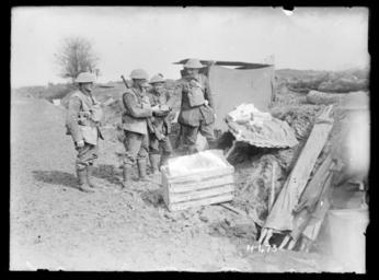 | Keywords: blackandwhite monochrome photo border outdoor black and white The Padre of the New Zealand Rifle Brigade operating a makeshift wayside canteen for soldiers in the front line. Shows him handing a cake to a soldier. Stretchers are prominent in the right foreground. Photograph taken La Signy Farm 6 April 1918 by Henry Armytage Sanders. Inscriptions: Inscribed - Photographer's title on negative -bottom right: H473. Quantity: 1 b&w original negative(s). Physical Description: Dry plate glass negative 4.75 x 6.5 inches A New Zealand padre with his wayside canteen on the Western Front. Royal New Zealand Returned and Services' Association :New Zealand official negatives, World War 1914-1918. Ref: 1/2-013091-G. Alexander Turnbull Library, Wellington, New Zealand. natlib.govt.nz/records/23076881 The Padre of the New Zealand Rifle Brigade operating a makeshift wayside canteen for soldiers in the front line. Shows him handing a cake to a soldier. Stretchers are prominent in the right foreground. Photograph taken La Signy Farm 6 April 1918 by Henry Armytage Sanders. Inscriptions: Inscribed - Photographer's title on negative -bottom right: H473. Quantity: 1 b&w original negative(s). Physical Description: Dry plate glass negative 4.75 x 6.5 inches A New Zealand padre with his wayside canteen on the Western Front. Royal New Zealand Returned and Services' Association :New Zealand official negatives, World War 1914-1918. Ref: 1/2-013091-G. Alexander Turnbull Library, Wellington, New Zealand. natlib.govt.nz/records/23076881 |