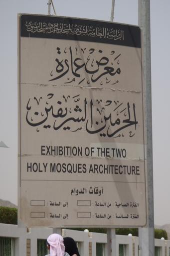 | Keywords: A signboard in front of the Exhibition of The Two Holy Mosques Architecture, Makkah.jpg ms Papan tanda di hadapan bangunan Pameran Seni Bina Dua Masjid Suci di Mekah en A signboard in front of the Exhibition of The Two Holy Mosques Architecture Makkah 2011-07-12 own Kerina yin This is probably a construction signboard cc-zero Uploaded with UploadWizard Mecca in the 2010s Signboard Arabic calligraphy ImageNote 1 647 664 323 306 1176 1764 2 Text reads as al-Haramain Translates as The Two Haram Lands which refers to Makkah and Madinah ImageNoteEnd 1 ImageNote 2 594 318 253 285 1176 1764 2 Translates as exhibition ImageNoteEnd 2 ImageNote 3 350 309 247 309 1176 1764 2 Translates as architecture ImageNoteEnd 3 ImageNote 4 179 635 467 312 1176 1764 2 Translates as The Two Holy Mosques which refers to Al-Masjid al-Ḥarām The Sacred Mosque and Al-Masjid al-Nabawi Mosque of the Prophet ImageNoteEnd 4 |