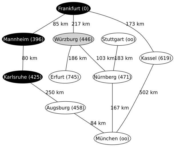 Keywords: A-Star4.svg Dritter Schritt Karlsruhe wurde erkundet als nächstes wird Würzburg untersucht Fourth step of a run of the A search Algorithm on a map of Germany Created by Regnaron with graphviz A search algorithm 2005-11-06 own assumed Regnaron~commonswiki |