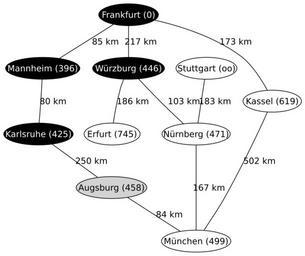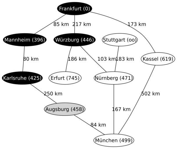 Keywords: A-Star5.svg Fifth step of a run of the A search Algorithm on a map of Germany Created by Regnaron with graphviz A search algorithm 2005-11-06 own assumed Regnaron~commonswiki