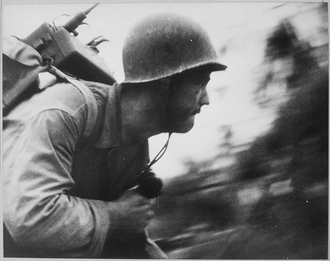 Keywords: A US Marine charges across the beach on Peleliu Island, Palau Islands, the "walkie talkie" firmly strapped to his... - NARA - 520617.tif Scope and content General notes Use War and Conflict Number 1181 when ordering a reproduction or requesting information about this image 520617 Local identifier 80-G-48359 Department of Defense Department of the Navy Naval Photographic Center 09/18/1947 - Still Picture Records Section Special Media Archives Services Division NWCS-S National Archives at College Park 8601 Adelphi Road College Park MD 20740-6001 ca 09/1944 Record group Record Group 80 General Records of the Department of the Navy 1804 - 1983 Record group ARC 409 General Photographic File of the Department of Navy compiled 1943 - 1958 documenting the period 1900 - 1958 Series ARC 520587 File unit File unit ARC Variant control numbers NAIL Control Number NWDNS-80-G-48359 yes Other versions NARA-cooperation PD-USGov Battle of Peleliu Black and white photographs |