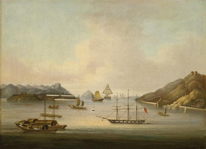 | Keywords: A view into the Bocca Tigris.jpg A view looking north-west into the Bocca Tigris or Bogue The Anunghoy forts are on the right or eastern shore that of South Wangtong Island on the left North Wangtong also with a fort is invisible behind this at a distance of 900 yards with the higher mainland behind that and to the left The channel between the Wangtong and Anunghoy side is only 750 yards wide the forts forming the 'teeth' of the 'tiger's mouth' In the distance here a western ship is coming down the river from Canton with the south end of Tiger Island to the left The vessels in the foreground are in the very large and most southerly reach of the river before the outer headlands through which it joins the sea The British ship may be a Royal Naval sloop of about 18 guns despite the lack of a naval pennant and is flying 'blue peter' P-flag at the main as an indication of being about to sail Mid-19th century http //collections rmg co uk/collections/objects/13263 html Chinese School PD-Art-100 Bocca Tigris Paintings in the National Maritime Museum London Pearl River in Guangzhou |