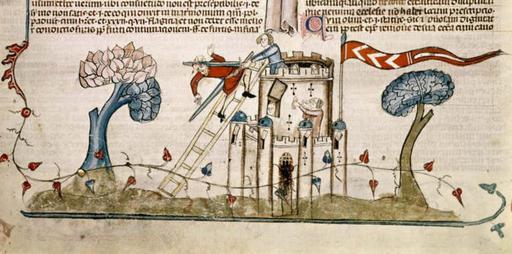 Keywords: A woman defends her castle.jpg en Detail Bas-de-page scene of a man falling from a ladder as he hit by a woman wielding a sword as he attacks a castle Title of Work Smithfield Decretals Decretals of Gregory IX Author Raymund of Peñafort editor; Bernard of Parma glossator Production France ; 1300-1340 text England London ; circa 1340 illumination Language Latin user Leinad-Z from http //www imagesonline bl uk/britishlibrary/controller/textsearch text woman+castle y 0 x 0 idx 1 startid 12393 PD-old-auto Medieval women Smithfield Decretals Decretals of Gregory IX c 1340 - BL Royal MS 10 E IV Gender-role reversals or women in power Tournaments in art Ladders in art Paintings of castles Assault on the Castle of Love |