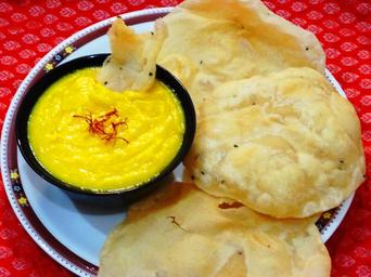 Keywords: Aamras Serving.jpg en Aamras is usually served with poori and flavoured with saffron 2016-06-19 16 13 24 own Miansari66 other versions cc-zero Cuisine of Karachi Cuisine of India