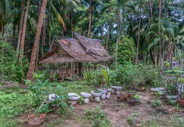 Keywords: abandoned building decay architecture structure crumbling exterior outdoor nature hut tropical thailand palm trees forest old damage house home neglect