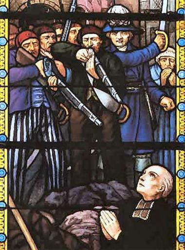 Keywords: Abbé Nicolas.jpg en Stained glass window of the church in Chambretaud presenting the assassination of abbot François Nicolas by the French republican soldiers http //www loire-france com/histoire/guerres-vendee/vitraux/galerie/pages/vitrail-042 htm R Desjardins 1931 PD-old Stained glass windows in Vendée Église Notre-Dame-de-la-Nativité de Chambretaud Victims of the French Revolution Refractory clergy |