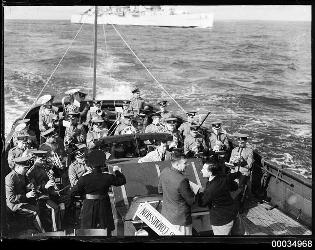 Keywords: hood collection hoodcollection samuel j hood collection samueljhoodcollection hood royal australian navy royalaustraliannavy navy naval vessel navalvessel sydney hmas australia hmasaustralia flagship hmas canberra hmascanberra abc australian broadcasting commission australianbroadcastingcommission military band militaryband abc military band abcmilitaryband national military band nationalmilitaryband sydney heads sydneyheads sydney harbour sydneyharbour stanley ash stanleyash stan ash stanash blackandwhite monochrome photo border black and white This photograph probably depicts the Australian Broadcasting Commission 22-piece Military Band (also known as the National Military Band) with a conductor, possibly Stephen Yorke, performing on board a small vessel with an Australian Broadcasting Commission commentator. A Royal Australian Navy heavy cruiser - either HMAS AUSTRALIA or HMAS CANBERRA - can be seen in the distance. This photo is part of the Australian National Maritime Museum’s Samuel J. Hood Studio collection. Sam Hood (1872-1953) was a Sydney photographer with a passion for ships. His 60-year career spanned the romantic age of sail and two world wars. The photos in the collection were taken mainly in Sydney and Newcastle during the first half of the 20th century. The ANMM undertakes research and accepts public comments that enhance the information we hold about images in our collection. This record has been updated accordingly. Photographer: Samuel J. Hood Studio Collection Object no. 00034968 This photograph probably depicts the Australian Broadcasting Commission 22-piece Military Band (also known as the National Military Band) with a conductor, possibly Stephen Yorke, performing on board a small vessel with an Australian Broadcasting Commission commentator. A Royal Australian Navy heavy cruiser - either HMAS AUSTRALIA or HMAS CANBERRA - can be seen in the distance. This photo is part of the Australian National Maritime Museum’s Samuel J. Hood Studio collection. Sam Hood (1872-1953) was a Sydney photographer with a passion for ships. His 60-year career spanned the romantic age of sail and two world wars. The photos in the collection were taken mainly in Sydney and Newcastle during the first half of the 20th century. The ANMM undertakes research and accepts public comments that enhance the information we hold about images in our collection. This record has been updated accordingly. Photographer: Samuel J. Hood Studio Collection Object no. 00034968 |