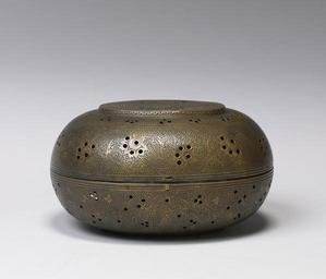 | Keywords: Abu'l-Kharid Nur al-Hasan Khan - Betel or Paan Box with Inscription and Floral Scrolls - Walters 53153.jpg  This box is a pandan a container for betel - thin slices of the nut of the areca palm mixed with spices and lime paste made from ground seashells and wrapped in a leaf of the betel tree Betel chewed after meals to help with digestion was very popular in the Punjab region This box is inscribed with the name of its owner Abu'l-Kharid Nur al-Hasan Khan century 19 British Raj engraved brass cm 15 3 9 5 accession number 53 153 3248 Peter Marks Works of Art New York Walters Art Museum Baltimore 1988 by purchase Museum purchase with funds provided by the Ambassador and Mrs William J Sebald Fund 1988 Translation Abu'l-Kharid Nur al-Hasan Khan place of origin Punjab India Walters Art Museum license Islamic metalwork in the Walters Art Museum Betel containers Brass vessels containers Media contributed by the Walters Art Museum needs category review Media contributed by the Walters Art Museum needs artist review |